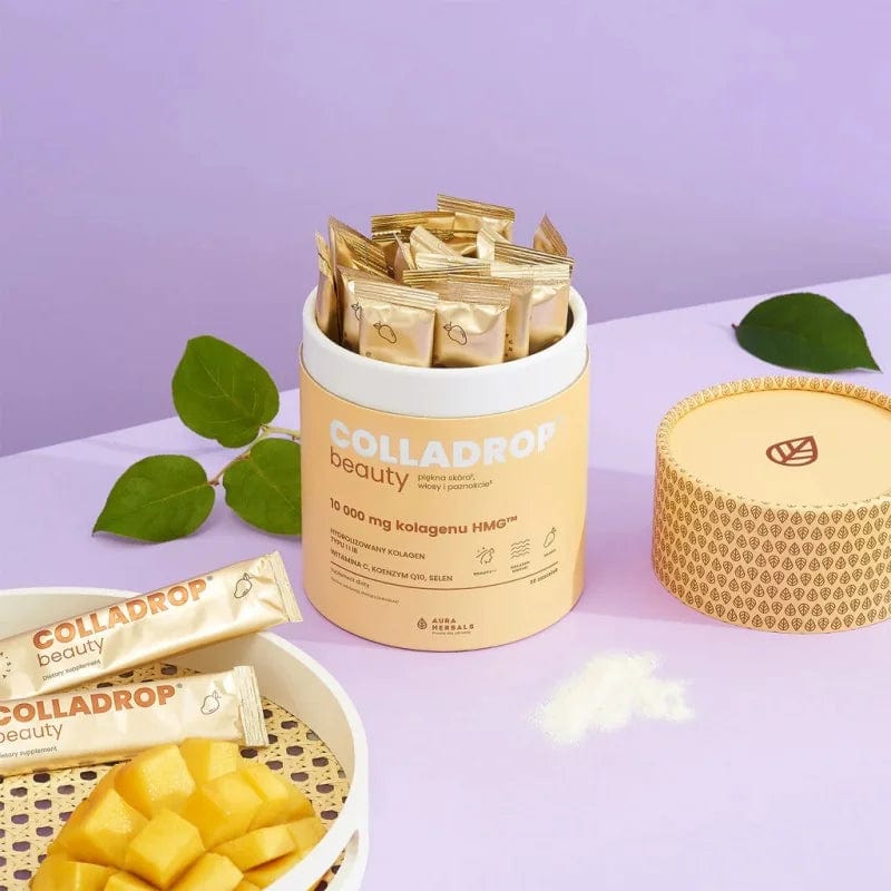 Colladrop ® Beauty, an HMG™ collagen by Aura Herbals, je práškový doplněk stravy s příchutí manga, který obsahuje hydrolyzovaný mořský kolagen typu I a III, koenzym Q10, selen a vitamín Quali ® -C této značky.
