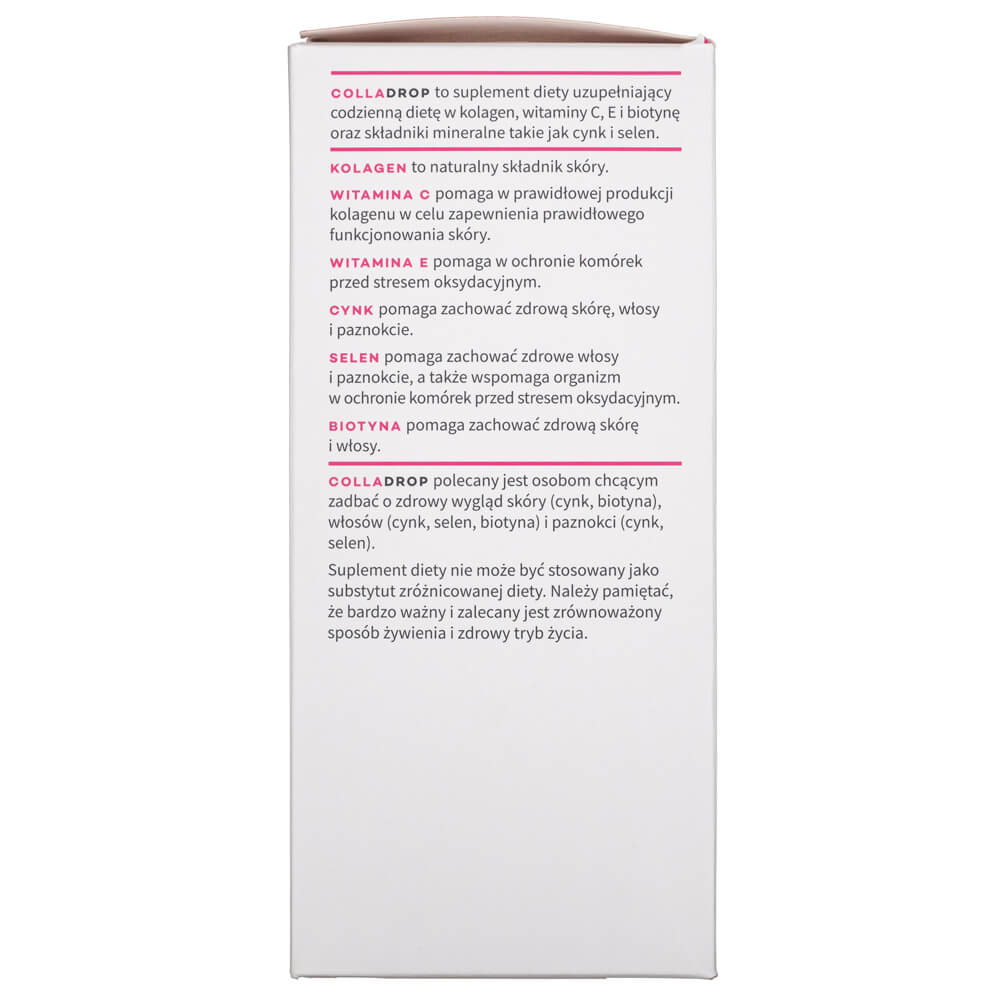 Voda, NatiCol® kolagen z kůže mořských ryb, sladidlo: invertní cukr, kyselina L-askorbová (vitamin C), glukonát zinečnatý, konzervant: sorban draselný, D-alfa-tokoferol (vitamin E), seleničitan sodný, D-biotin.