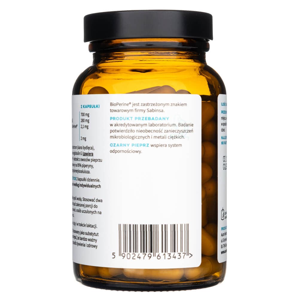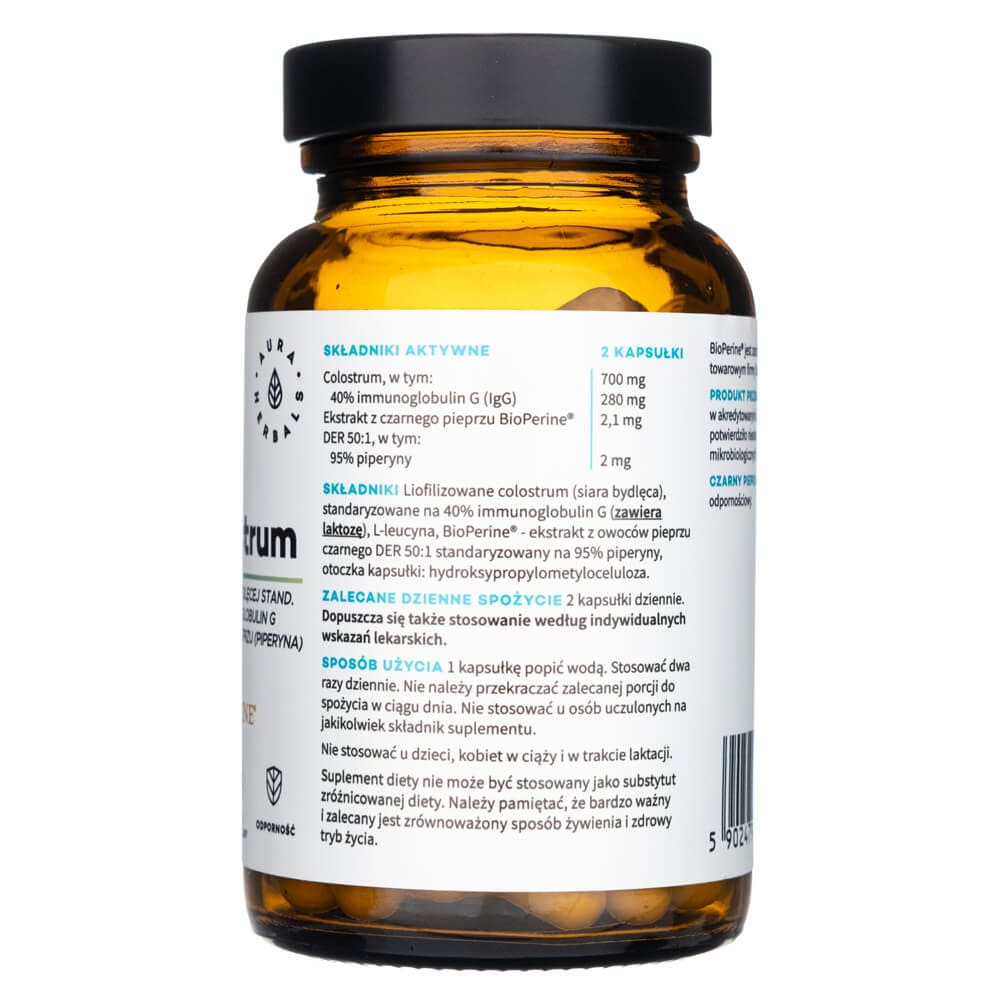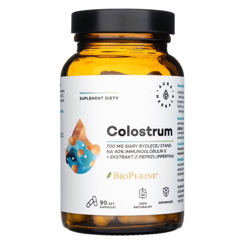 Colostrum je doplněk stravy v kapslích Aura Herbals, obsahující 700 mg hovězího kolostra standardizovaného na 40 % imunoglobulinu G, s přídavkem značkového výtažku z černého pepře BioPerine ® standardizovaného na 95 % piperinu. Černý pepř v doplňku napomáhá trávení a vstřebávání živin, a zvyšuje účinnost ostatních rostlinných složek.