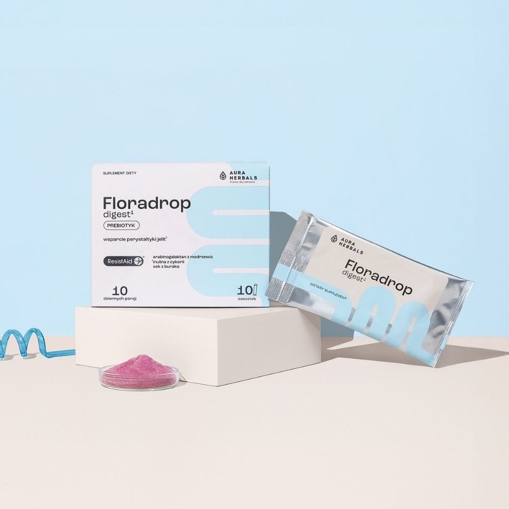 Aura Herbals Floradrop digest je práškový doplněk stravy v praktických sáčcích. Přírodní zdroj prebiotik . Obsahuje značkový extrakt z amerického modřínu (Larix laricina) standardizovaný na 85% arabinogalaktanu (ResistAid ®). S přidaným inulinem z čekanky a řepnou šťávou.