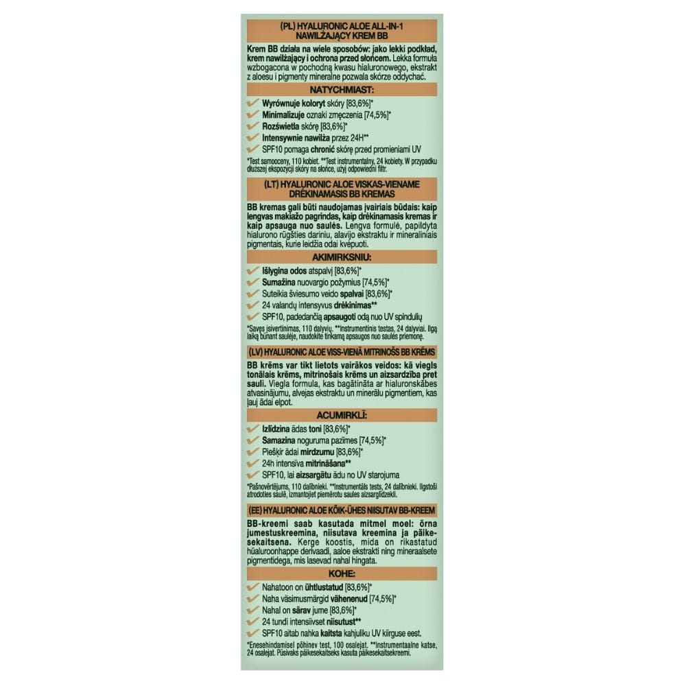Garnier BB krém je multifunkční přípravek, který v sobě spojuje vlastnosti lehkého podkladového krému, a sluneční ochrany. Jeho lehké složení, obohacené o derivát kyseliny hyaluronové, výtažek z aloe vera a minerální pigmenty, umožňuje pleti dýchat a je vhodný pro všechny typy pleti. BB krém okamžitě vyrovnává tón pleti, minimalizuje známky únavy, rozjasňuje pleť a intenzivně hydratuje po celých 24 hodin a zároveň poskytuje ochranu SPF10 .