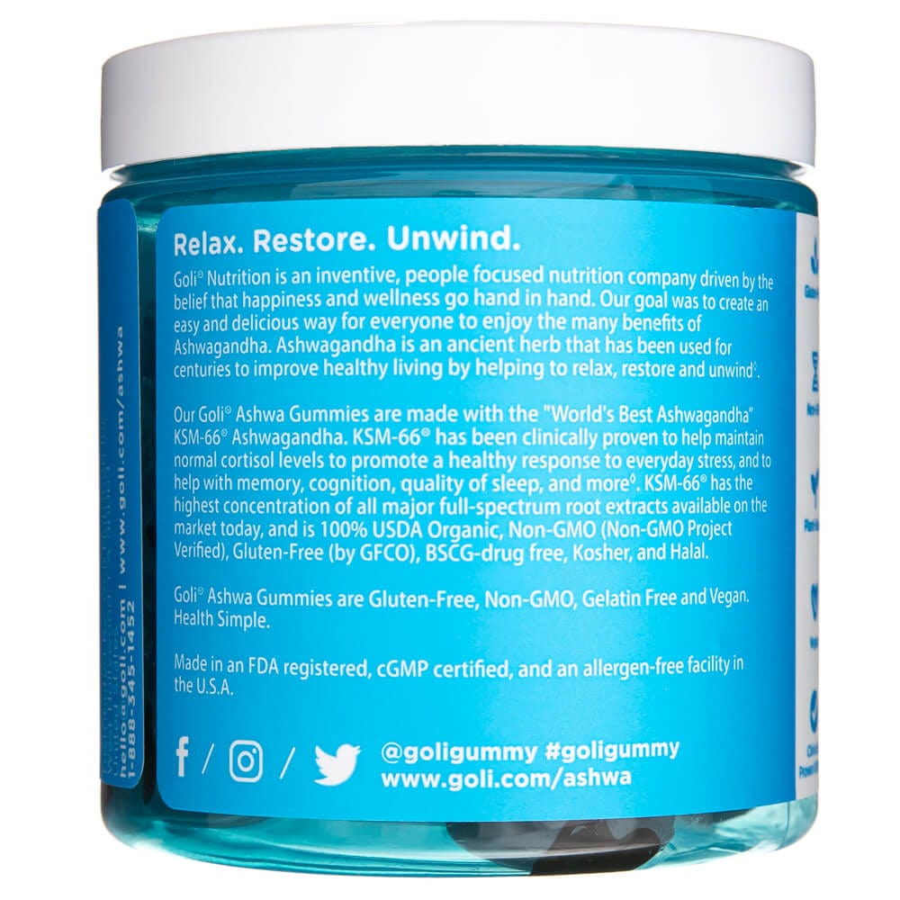 Ashwagandha od Goli Nutrition je doplněk stravy ve formě želé bonbónů s příchutí lesních plodů, které obsahují extrakt z kořene Ashwagandha KSM-66 ®. Receptura je také obohacena o vitamín D2.