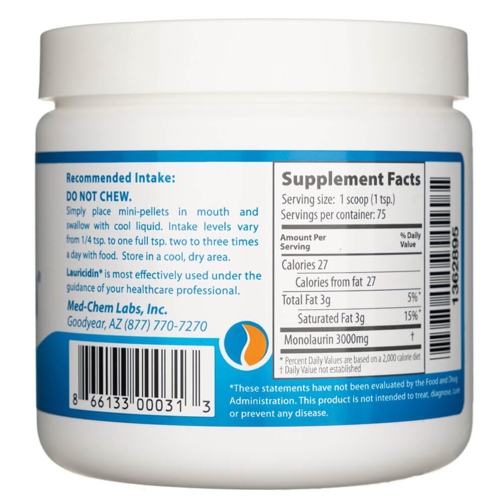 Lauricidin od společnosti Med-Chem Labs je doplněk stravy obsahující čistý monolaurin (monoglycerid C-12 sn1) získaný z kokosového oleje. Stejný monolaurin se získává z mateřského mléka, Saw Palmetto a hořkého melounu. Lauricidin® je koncentrát kyseliny laurové ((3) -monolaurin) ve formě miniaturních granulí (~30 mg jedna granule).