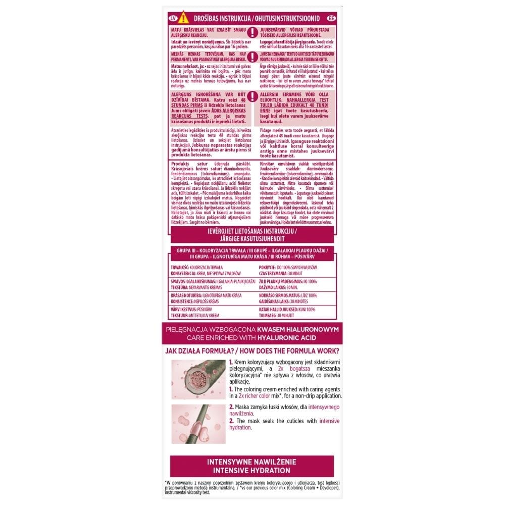 - Ochranný barvicí krém: Obohacený o pečující složky, poskytuje dlouhotrvající barvu. 2x bohatší barvicí směs* nestéká z vlasů, a usnadňuje tak aplikaci.