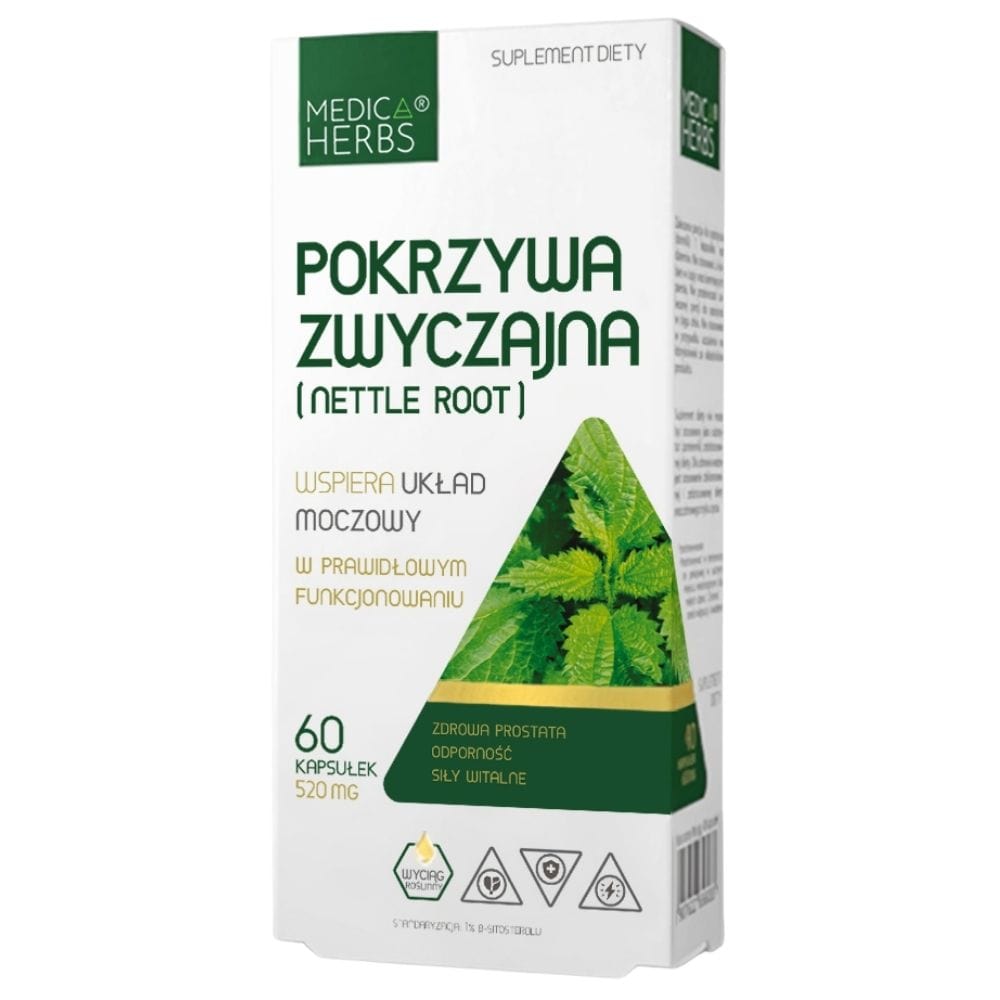 Medica Herbs Kopřiva dvoudomá (Kořen kopřivy dvoudomé) je doplněk stravy v kapslích. Zdroj extraktu z kořene Urtica dioica , standardizovaný na 1% β-sitosterol . Poskytuje 520 mg extraktu z kořene kopřivy v 1 kapsli.