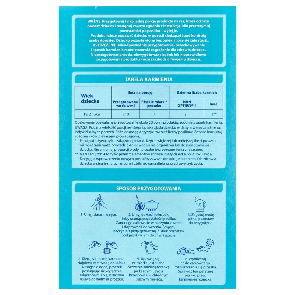 Nestle NAN OPTIpro 4 je mléčný výrobek určený pro malé děti starší 2 let. Obohacený o vitamíny a minerály. Nejedná se o náhradu mateřského mléka, ale o výrobek určený k usnadnění správného složení stravy dítěte.