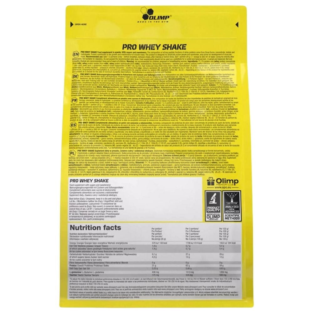 Olimp Pro Whey Shake je doplněk stravy v prášku. Proteinový doplněk vytvořený pro osoby se zvýšenou potřebou bílkovin, jejichž cílem je rozvoj svalové hmoty, především profesionálních sportovců a rekreačních cvičenců. Kombinuje tři zdroje bílkovin: hydrolyzát, izolát a syrovátkový koncentrát.