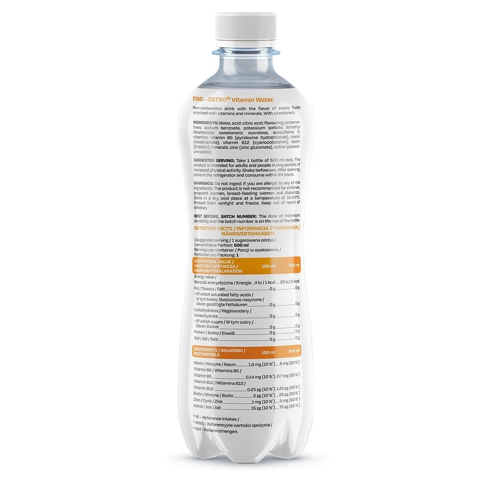 Ostrovit OSTRO ® Vitaminová voda je nízkoenergetický nesycený nápoj, který dodává tělu cenné vitaminy a minerály. Jedná se o výrobek s příchutí exotického ovoce bez přidaného cukru, vytvořený pro sportovce a osoby se zvýšenou potřebou cenných mikroživin.