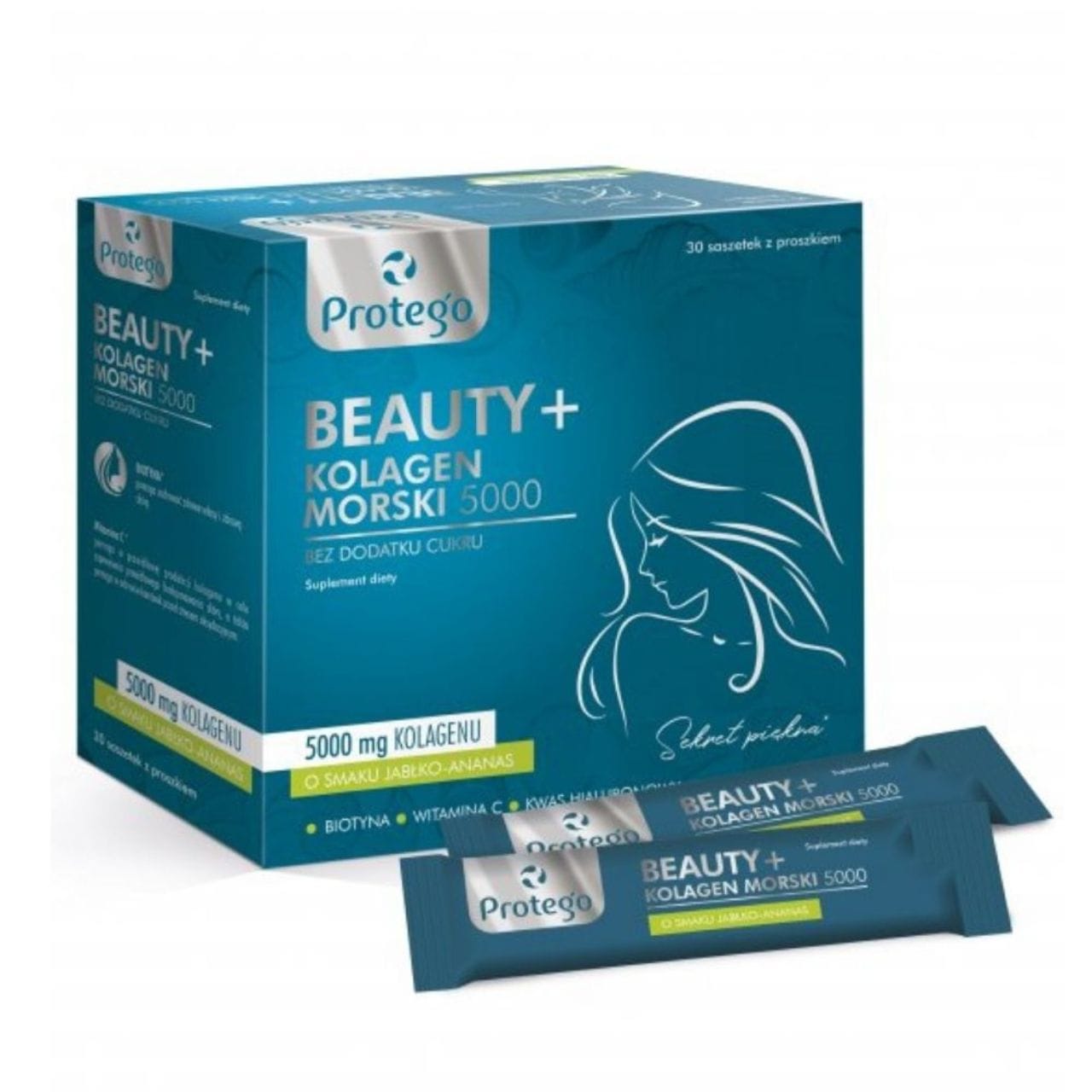 Protego BEAUTY + Marine Collagen 5000 je práškový doplněk stravy v praktických sáčcích. Jedno sáček obsahuje až 5,000 mg kolagenu, vitamínu C, kyseliny hyaluronové a biotinu.