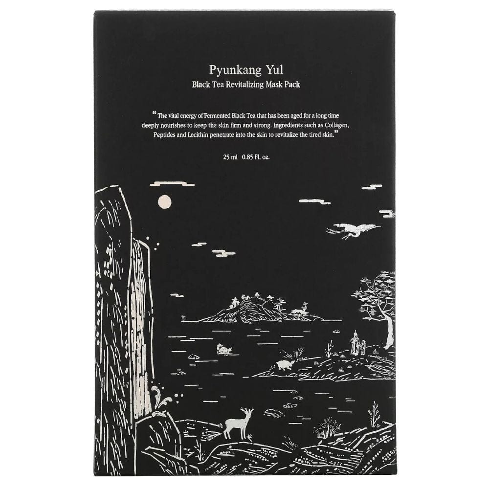 Pyunkang Yul Revitalizační maska s černým čajem jsou pleťové masky s extrakty z fermentovaného černého čaje, které intenzivně vyživují pokožku. Směs korejských bylinných extraktů a peptidů minimalizuje výskyt vrásek a dodává pokožce mladistvý, zdravý lesk tím, že stimuluje její pružnost. Receptura je obohacena o niacinamid, který rozjasňuje pigmentové skvrny a sjednocuje tón pleti. Masky byly testovány na podráždění pokožky, , takže jsou vhodné i pro citlivé typy pleti.