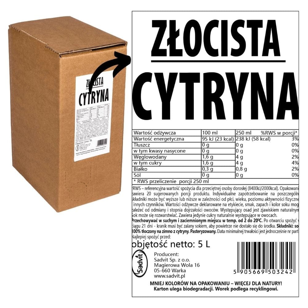 Sadvit Lemon Juice Golden Lemon 100% je NFC (nekoncentrovaná) studena lisovaná šťáva obsahující pouze citrony. Pasterizovaná, bez přidaného cukru a látky zvýrazňující chuť.