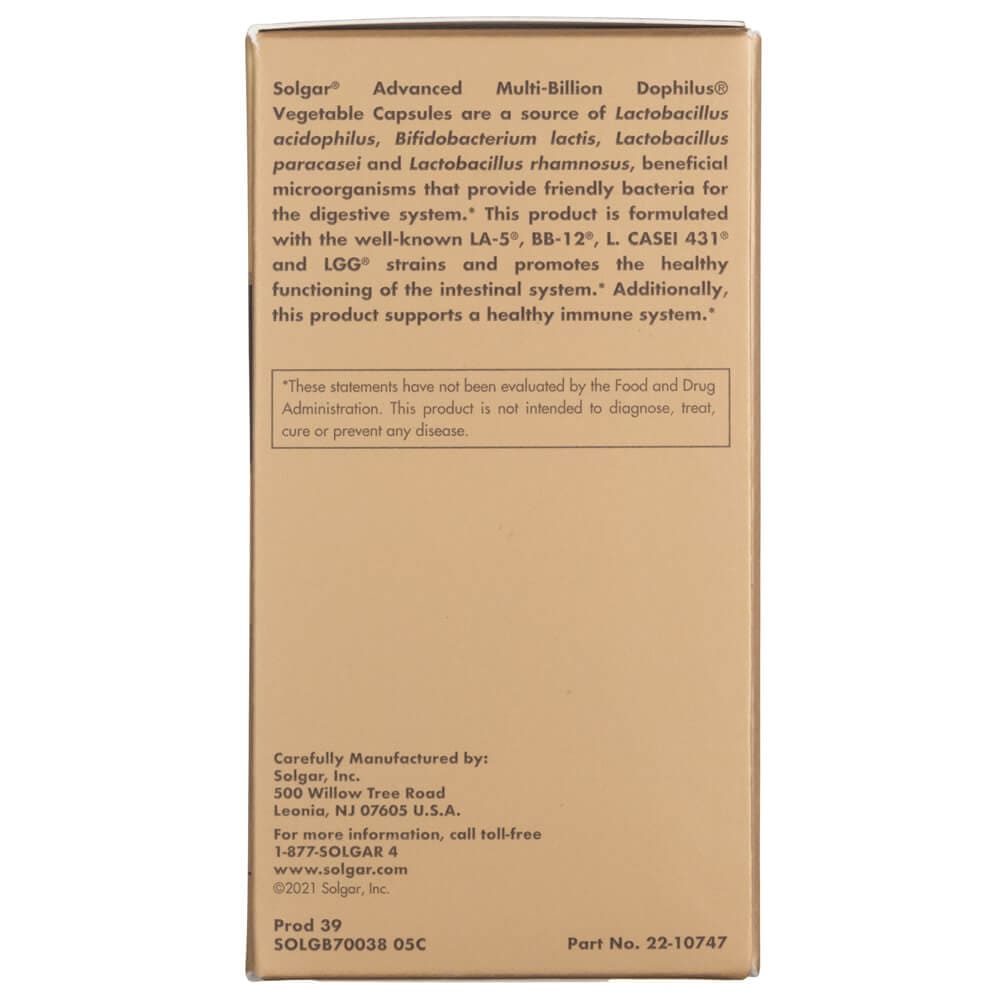 Solgar ® Zeleninové kapsle Advanced Multi-Billion Dophilus ® jsou zdrojem prospěšných mikroorganismů Lactobacillus acidophilus, Bifidobacterium lactis, Lactobacillus paracasei a Lactobacillus rhamnosus, které poskytují trávicímu systému přátelské bakterie. Složení tohoto produktu obsahuje známé kmeny LA-5 ®, BB-12 ®, L. CASEI 431 ® a LGG ® a podporuje zdravé fungování střevního systému. Kromě toho, tento produkt podporuje zdravý imunitní systém.