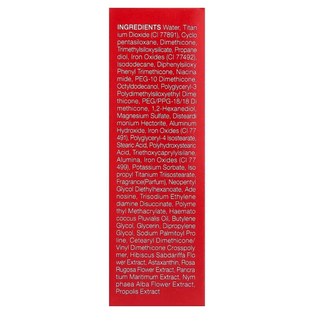 Voda, oxid titaničitý (ci 77891), cyklopentasiloxan, dimethikon, trimethylsiloxysilikát, propandiol, oxidy železa (ci 77492), isododekan, difenylsiloxyfenyl trimethikon, niacinamid, peg-10 dimethicone, octyldodecanol, polyglyceryl-3 polydimethylsiloxyethyl dimethicone, peg/ppg-18/18 di methicone,1,2-hexandiol, síran hořečnatý, disteardimonium hectorite, hydroxid hlinitý, oxidy železa (ci 77 491), polyglyceryl-4 isostearát, kyselina stearová, polyhydroxystearová kyselina, triethoxycaprylylsilan, oxid hlinitý, oxidy železa (ci 77 499), sorban draselný, isopropyl titanium triisostearate vonná látka (parfum), neopentyl glykol diethylhexanoát, adenosin, trisodný ethylendiamin disukcinát, polymethylmethakrylát, olej z haematococcus pluvialis, butylenglykol, glycerin, dipropylenglykol, palmitoyl prolin sodný, cetearyl dimethicone/ vinyl dimethicone crosspolymer, extrakt z květu hibiscus sabdariffa, astaxanthin, extrakt z květu rosa rugosa, extrakt z pancratium maritimum, extrakt z květu nymphaea alba, extrakt z propolisu.