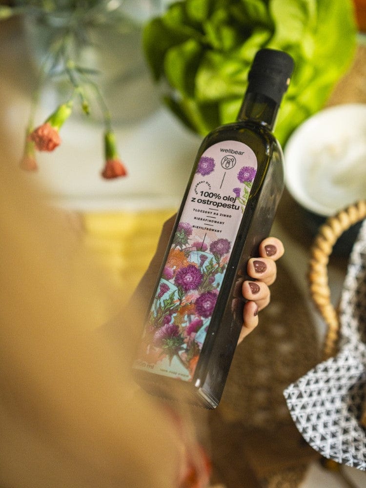 Olej z ostropestřce mariánského od Wellbear vám pomůže udržet vaše zdraví v nejlepší kondici. Olej je přírodní, nefiltrovaný a nerafinovaný, lisovaný za studena v polské olejnici. Neobsahuje žádné konzervační ani přidané látky, takže si zachovává své zdraví prospěšné vlastnosti až jeden měsíc po otevření lahvičky, pokud je uchováváte v ledničce.